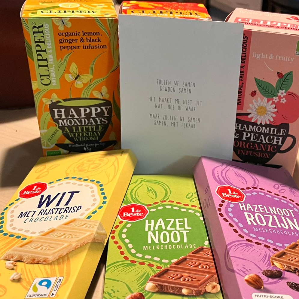 We genoten van het lekkers dat de catering had gemaakt en heerlijks wat de overburen waren komen brengen. Als kers op de taart waren er heerlijke bonbons van de bovenburen, als dank voor het fijne ‘samenwonen’.