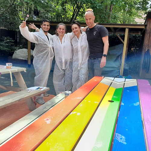 We waren al aan het peinzen hoe we meer diversiteit kunnen uitstralen. Een collega kwam op het idee om de picknicktafels te schilderen in de kleuren van de LHBTQIA+-vlag. Ook gauw de geplande regentonnen besteld, want nu is de kans om die te laten installeren. Hoe moet dat eigenlijk, waterpas, aan zinken regenpijpen koppelen, hebben we het juiste gereedschap in huis? Overleggen met locatieleider Ype of er onderhoudsbudget van de Horizon beschikbaar is. Dat is er, dus gauw materiaal kopen bij ijzerhandel Toon in de Spaarndammerstraat.