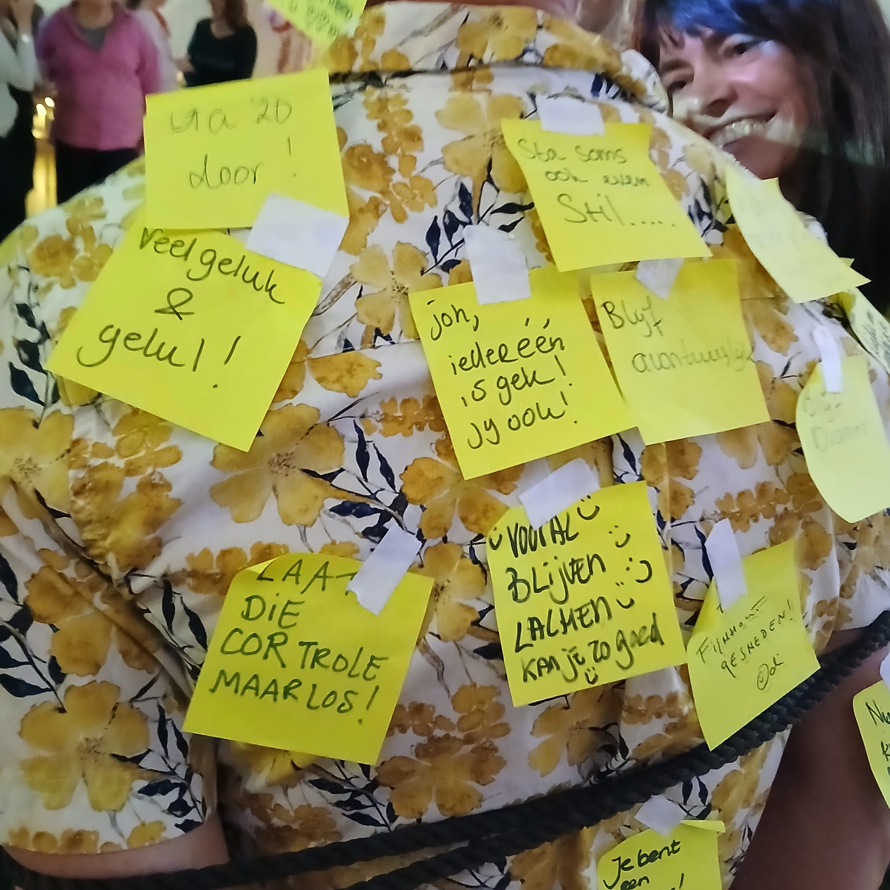 Nu mochten alle genodigden, die Cor graag kwamen uitzwaaien, tot overmaat van ramp boodschappen voor de toekomst op heel zijn lichaam plakken. We lazen verschillende ontroerende teksten, die werden meegegeven aan Cor.